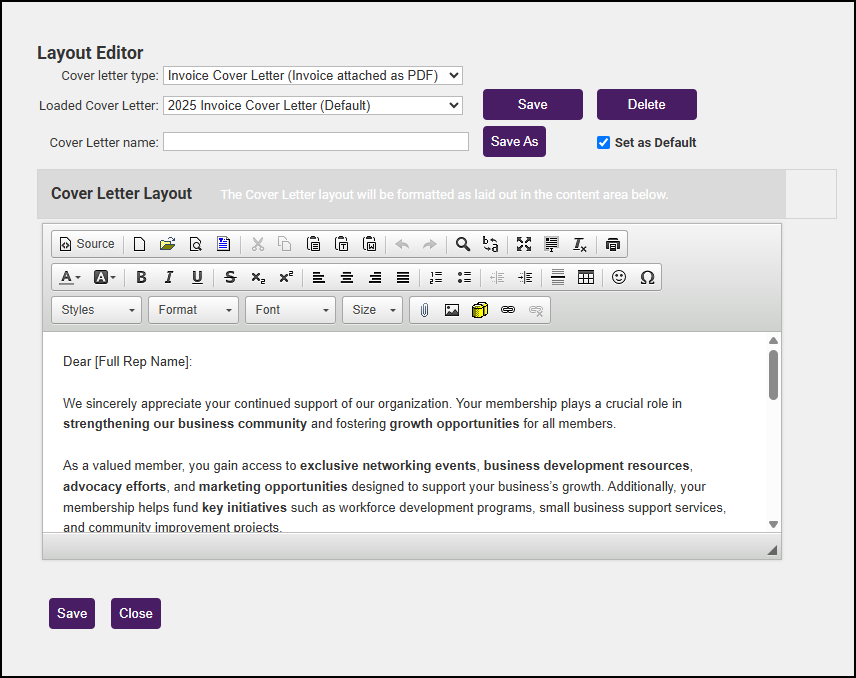 Cover Letter Templates can be included in the email sent along with your invoices. You may, for example, have a cover letter that is used when you initially send out your renewal invoices, and then a separate email template that is used when you send reminder invoices. Click here for a demonstration video.