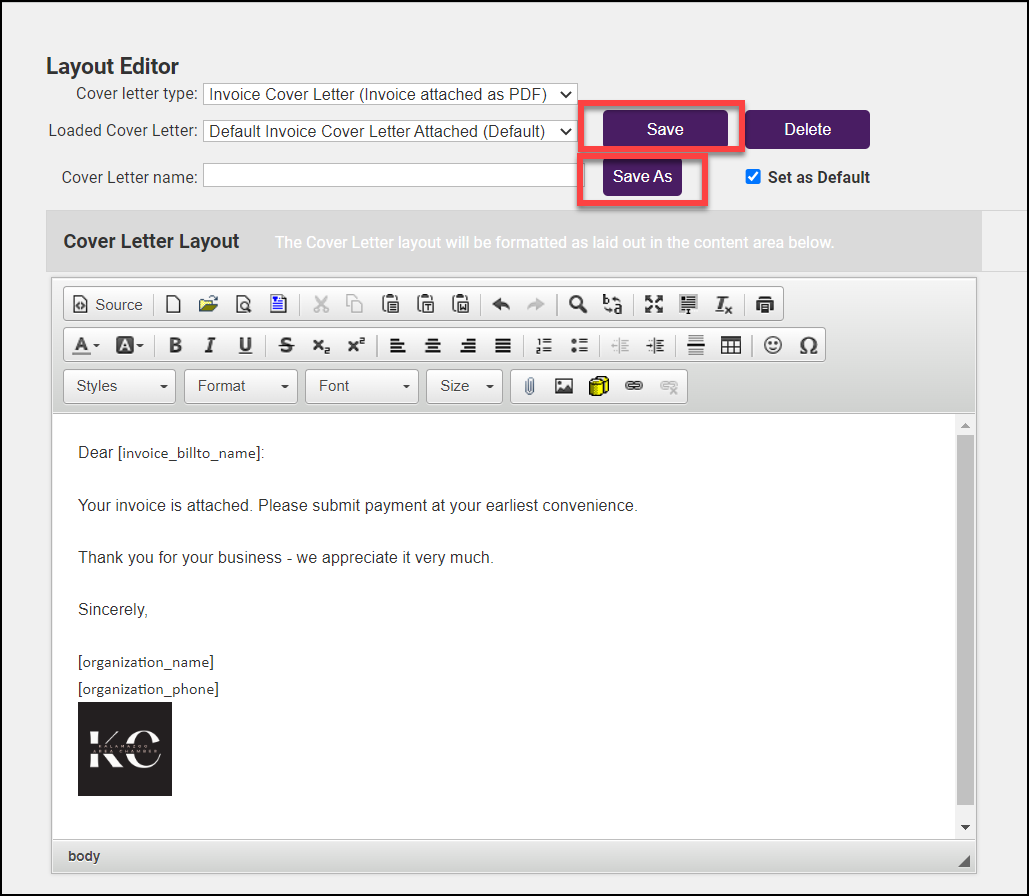 Click Template Manager - Cover Letters in the Billing section. The Layout Editor screen will, by default, display Invoice cover letters, but this screen can be used for updating cover letters for statements, credits, receipts, and payments.