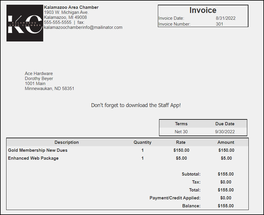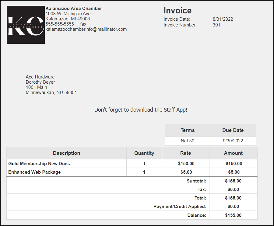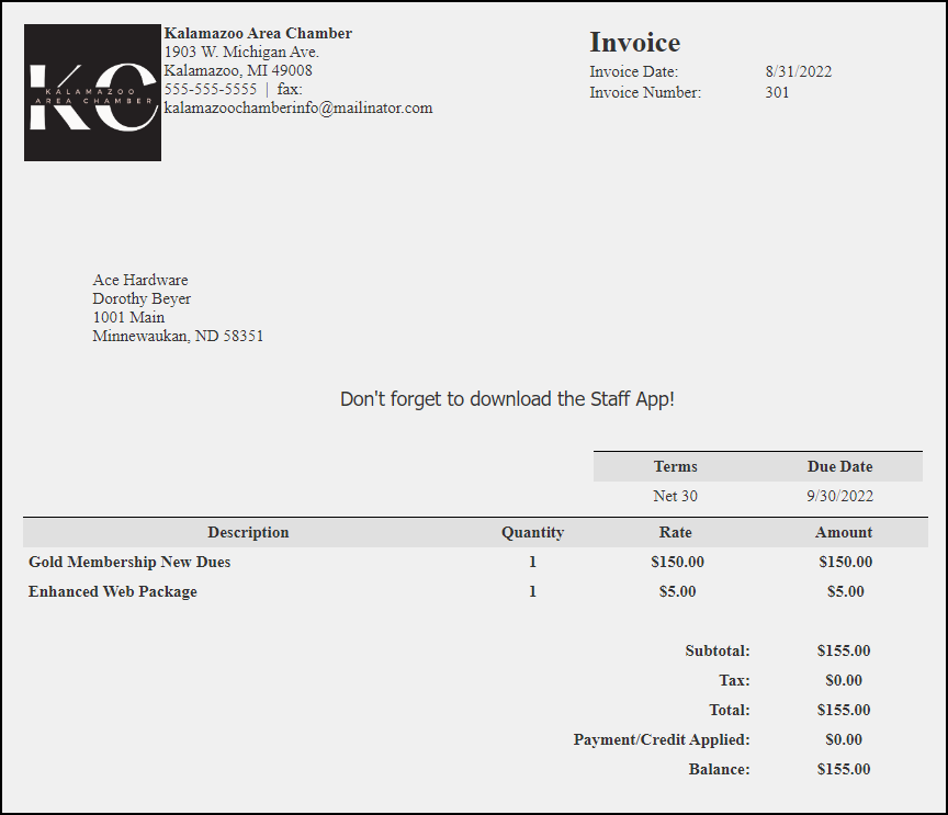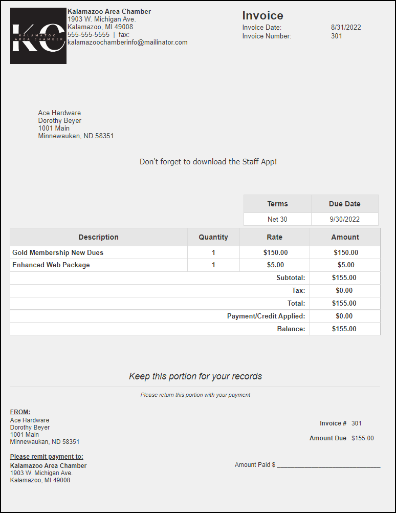 In addition to the original default invoice, there are nine other selections, each including a tear-off portion that will instruct members to return the bottom portion of the invoice with their payment.
