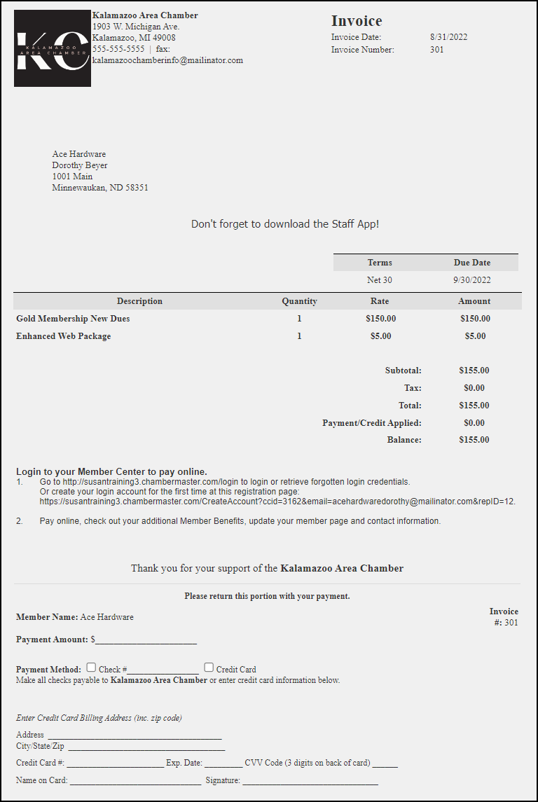 Selecting a template "[CC Tear Off & Login]" will also provide instructions for the member to log in and pay online - displaying their unique login and password. Don't accept credit card payments? Simply select a template "[Tear Off]" only.