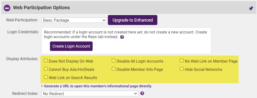 - NOTE: When Web Participation is set to Non-Member, only three Display Attributes are available: Does Not Display on Web, Hide Social Networks, and Web Link on Search Results.