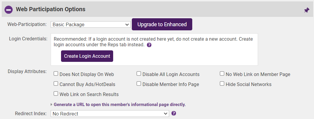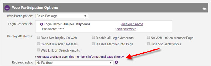 - On the member's Web tab, click Generate a URL to open this member’s informational page directly in the Web Participation Options section.