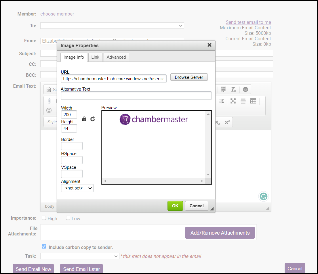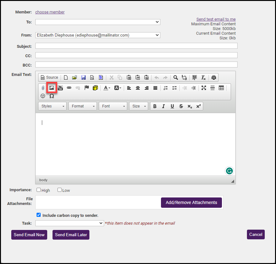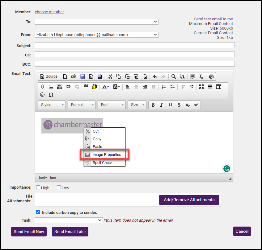 The editor can be accessed from multiple places within ChamberMaster. For one example, click New Email to Multiple Members in the Communication module. After selecting the desired recipients, the correspondence editor will display. Graphics may also be included in your signature block. Perform the same steps shown here but save it within your signature block.