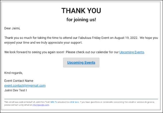 An email template has been provided in your database to make it easy for you to thank those who have attended your events. This template is designed to be short and sweet, thanking your guests for attending and for their support. The template can be expanded upon to include a short summary with key highlights from the event. It closes with a call-to-action to keep your members engaged, with the focus of guiding attendees to your event calendar to browse through your future events. (Other call-to-actions could include: a survey, a callout for a specific upcoming event, signing up for a newsletter, or following on social media.)