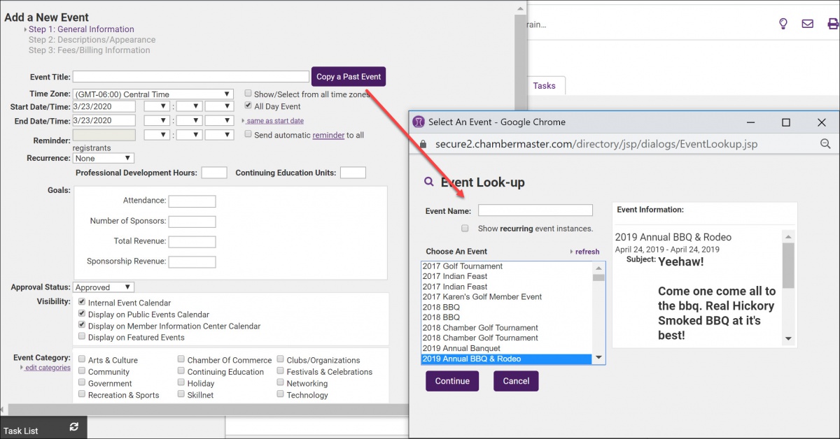 - Make a copy of the new event (with new dates). See Copy an Event.