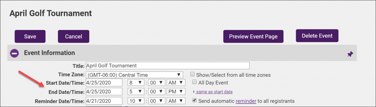 - On the event's General tab, turn off the automated reminder for the event (if applicable).