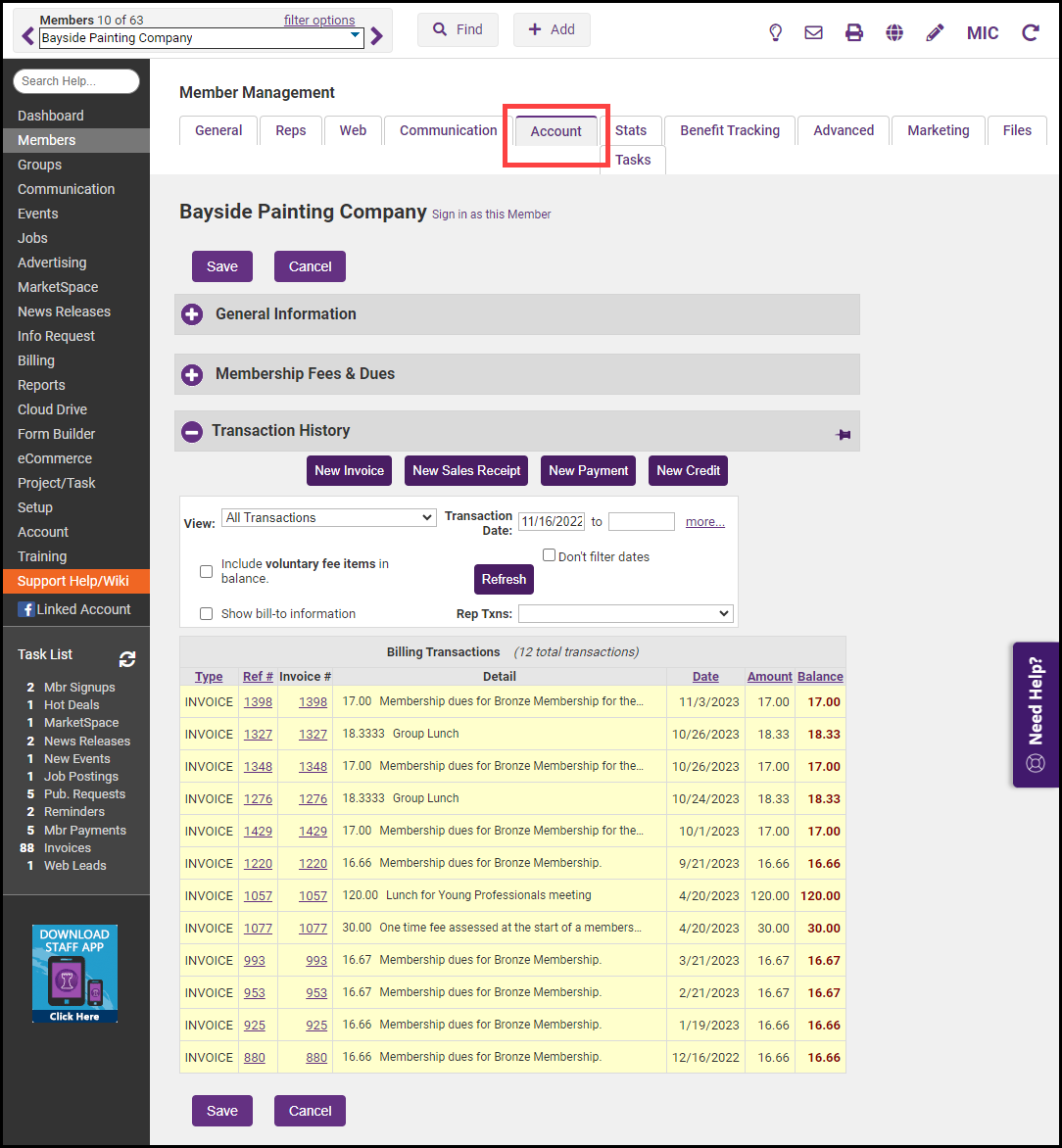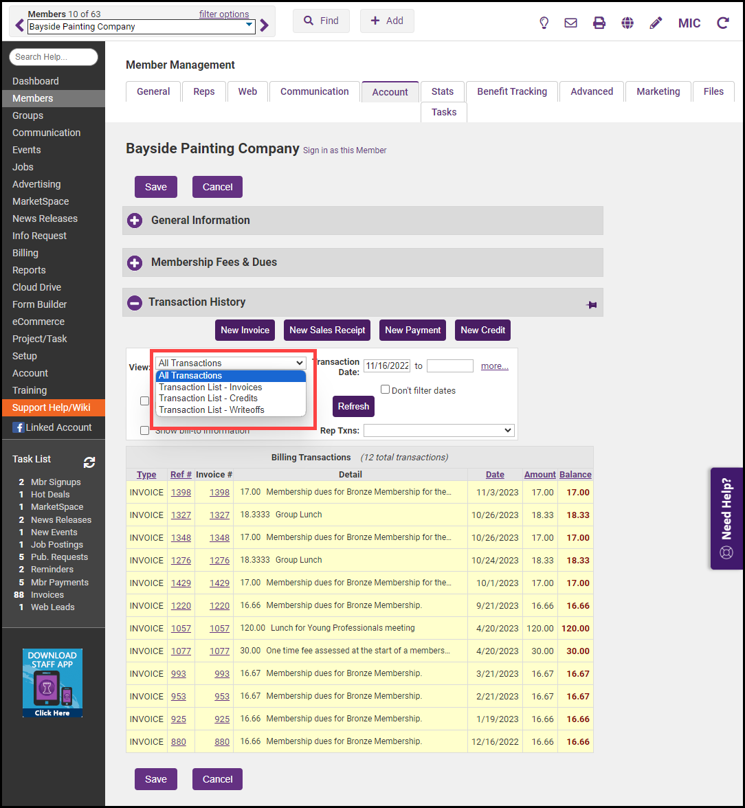 Transaction History displays all invoices, payments, credits, and sales receipts from integrated Billing. New invoices, sales receipts, payments, and credits may be created here by those with Administrator or Finance permissions.