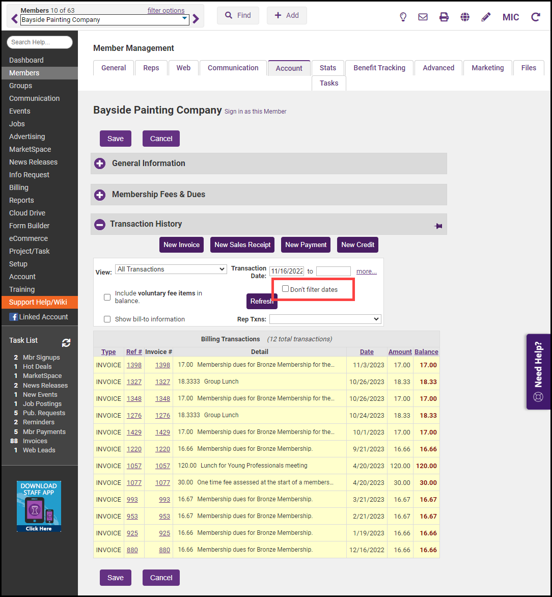 - Select Don't filter dates to display all transactions for the member, regardless of date.