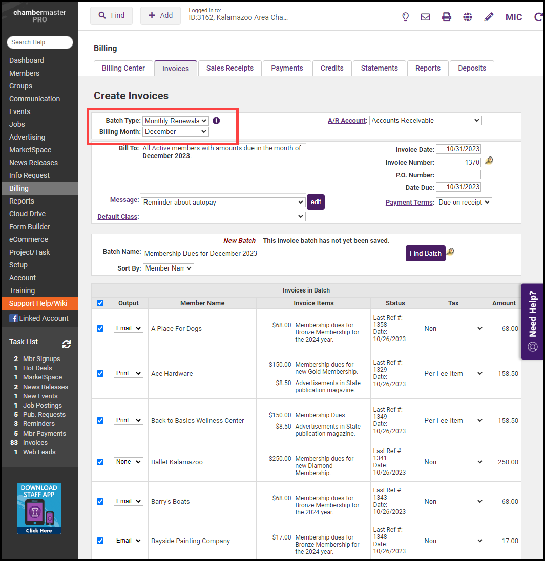 Invoices may be placed in a new batch instead of added to the original batch by using the New Batch button at the bottom of the event, monthly renewals, monthly epayment, and group invoice lists. This accommodates unique invoice selections (e.g. invoice date) to be placed on the added invoices.