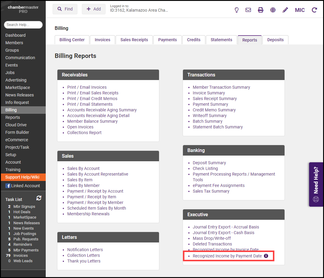- Click Recognized Income by Payment Date in the Executive section.