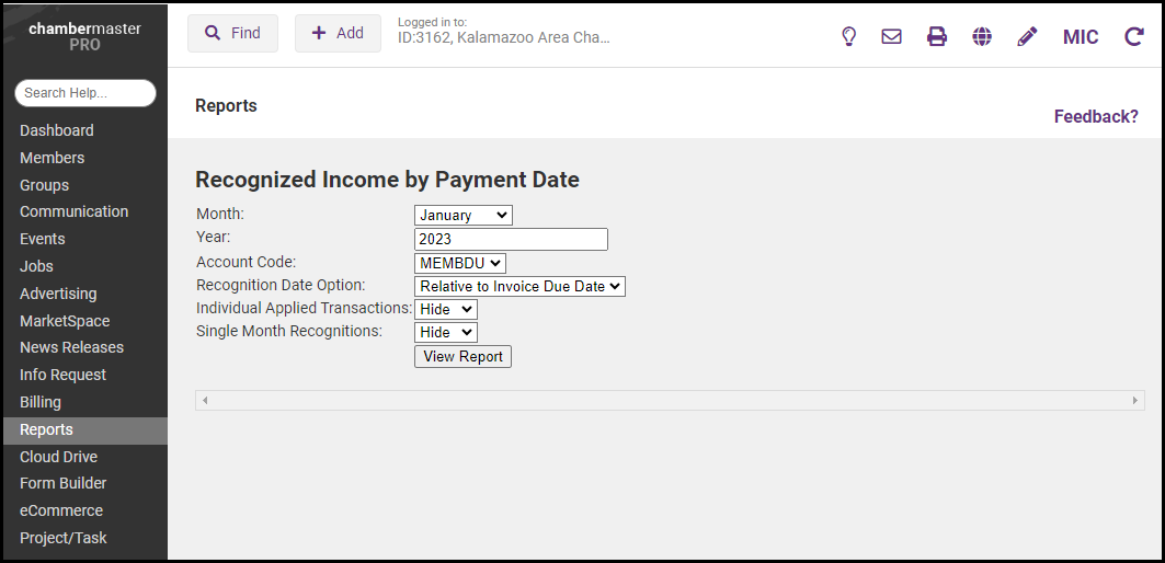 NOTE: Before using the recognized income reports, account codes need to be assigned within the Chart of Accounts. Each deferred liability account should have its own account code so that revenue can be recognized and moved to the appropriate income account each month. |