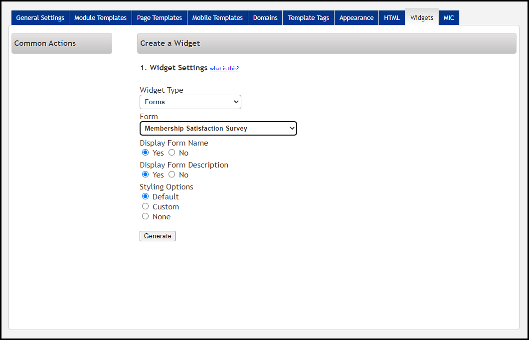 On the Distribute Form tab, click the Generate widget code link. This will bring you into the Integration Settings Control Panel (ISCP).
