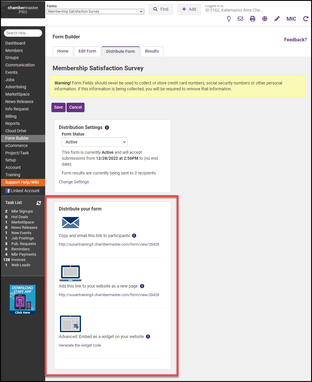 Paste the link directly into your email. Mass emails can be sent within your ChamberMaster software.