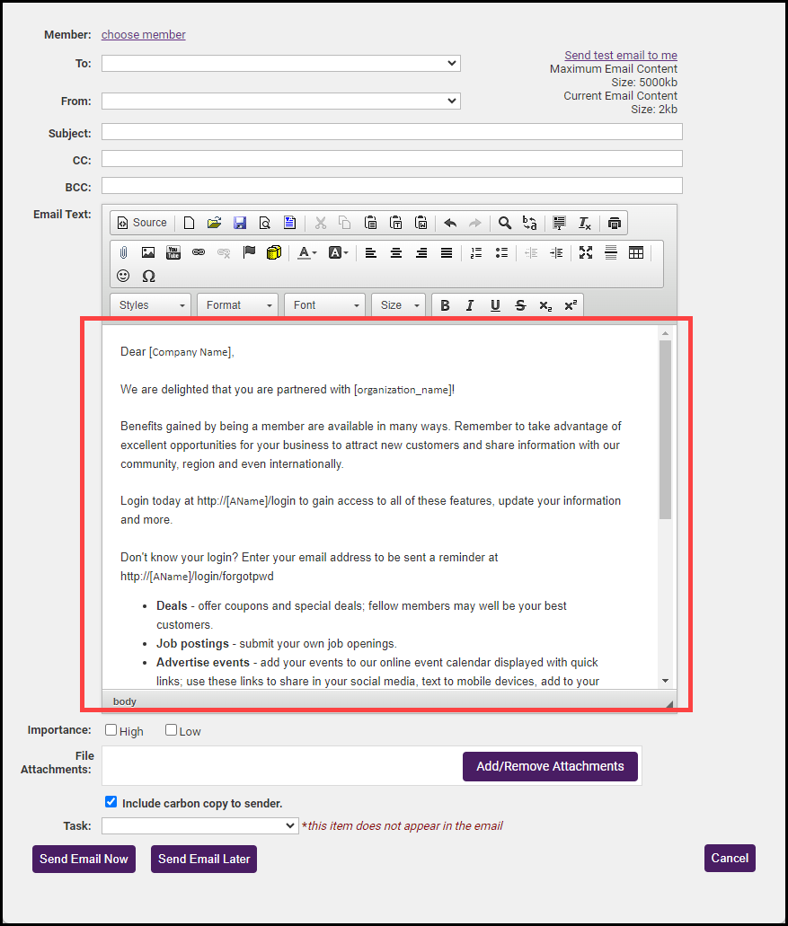 Click the desired template. The Email Text (body of your email) will automatically be populated with the template.