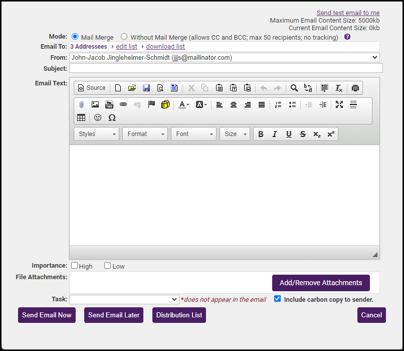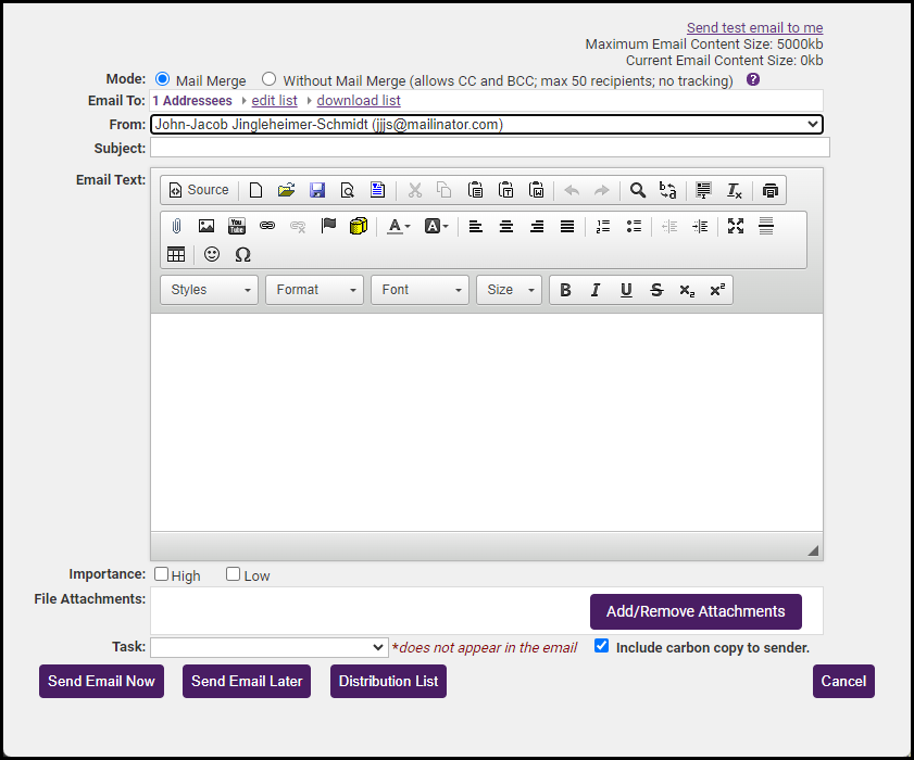 - Complete the Send an email screen and select Send Email Now.