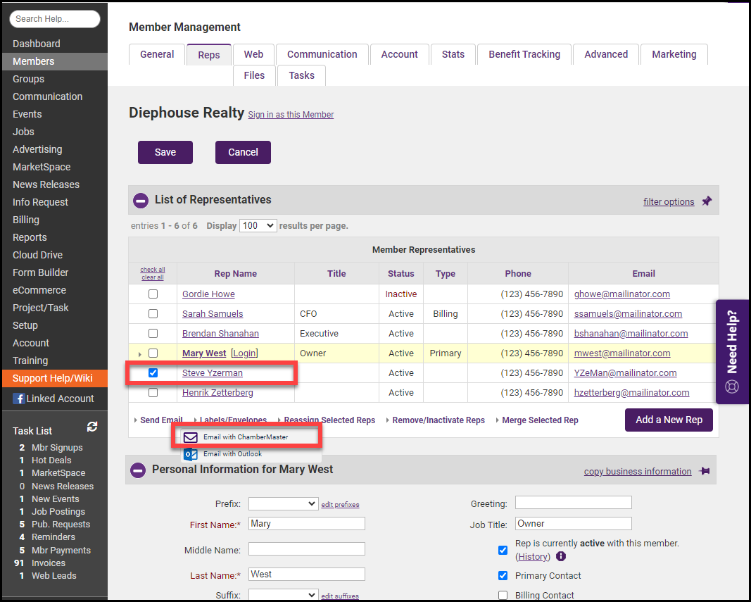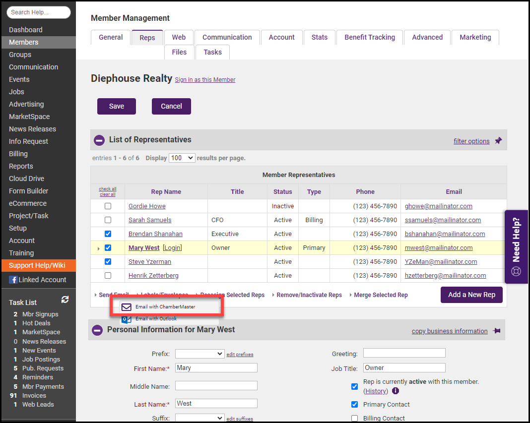 - Hover over Send email and select Email with ChamberMaster or Email with Outlook. See Email Sending Options for more information.