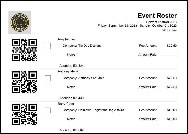 Print your Event Roster with attendee QR Codes printed next to their name and bring the roster with you to the event. You can use this to quickly check-in attendees at your next event using the free ChamberMaster/MemberZone StaffApp.