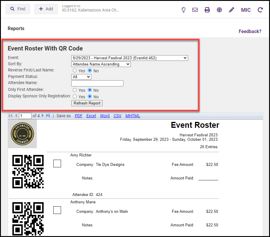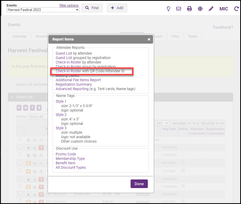 - Select the Check-in Roster with QR Code/Attendee ID report from the menu.