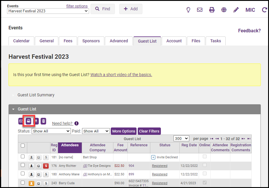 - On the Guest List tab, click the Reports icon in the Guest List section.