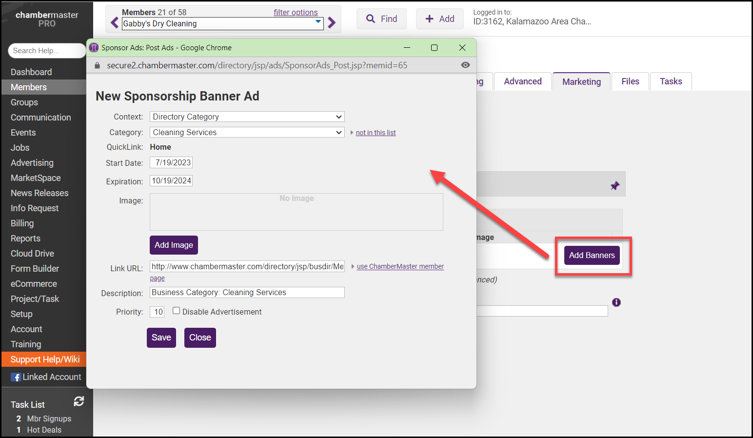 - Enter the member's website in the Link URL field to direct users to the member's website when clicking the banner ad. If the member does not have a website, you may select to link to their use ChamberMaster member to send users to their page in your directory. Note: URLs are limite to 250 characters.