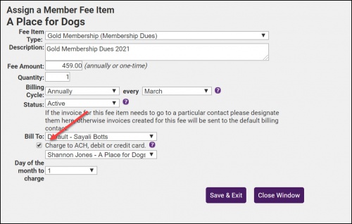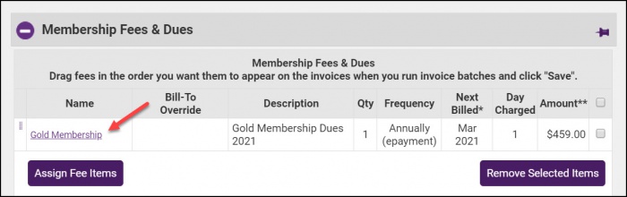 - In the Membership Fees & Dues section, click the Name of the fee for which you wish to change the auto-charge date.