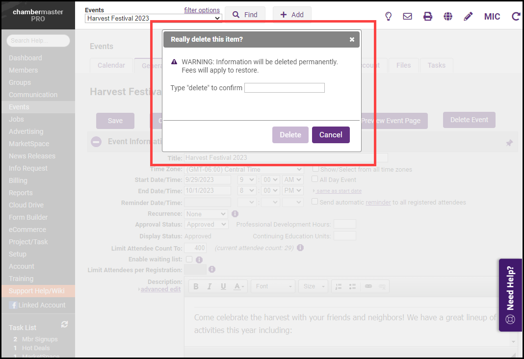NOTE: Deleting an event will remove all history of participants, sponsors, and fees. This information will no longer be available in reports. Use this option with caution. If you delete an event in error and wish GrowthZone to restore the event, fees will be applied.