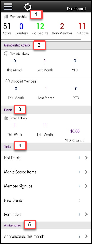 - Memberships: The Memberships section will display the number of Active & Courtesy members. Clicking on the number will open the directory and display those members.