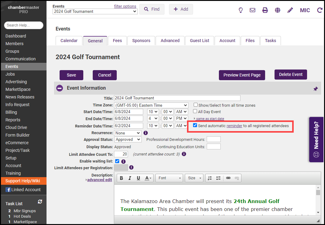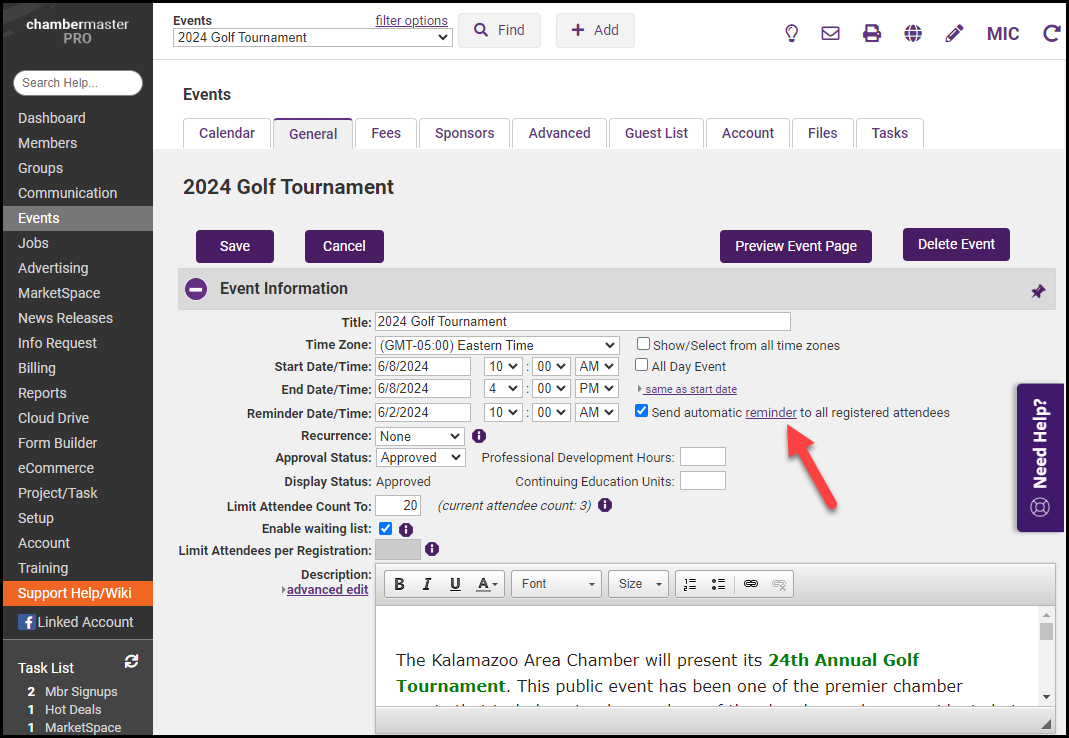 - In the Event Information section, select the Send automatic reminder to all registrants checkbox.