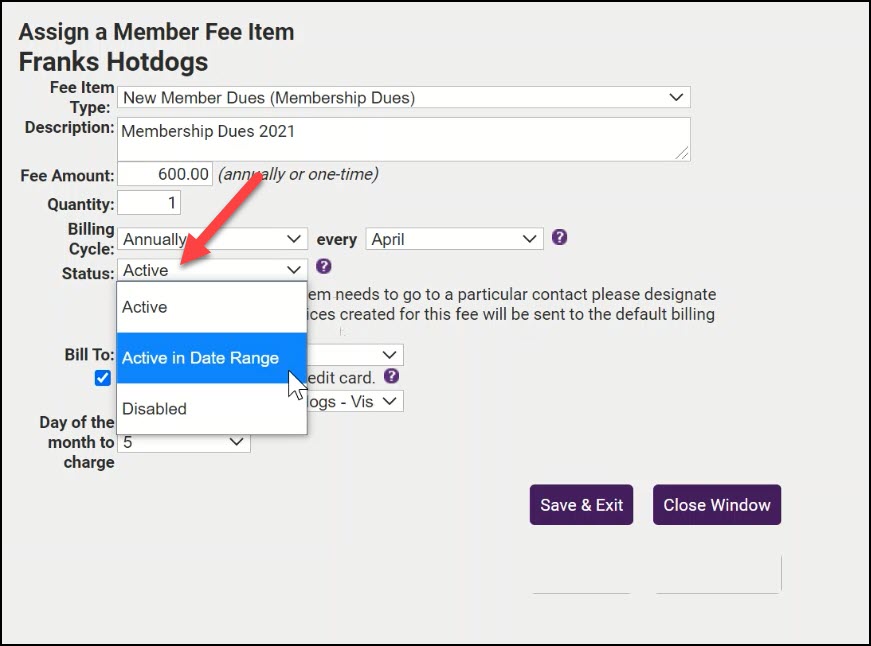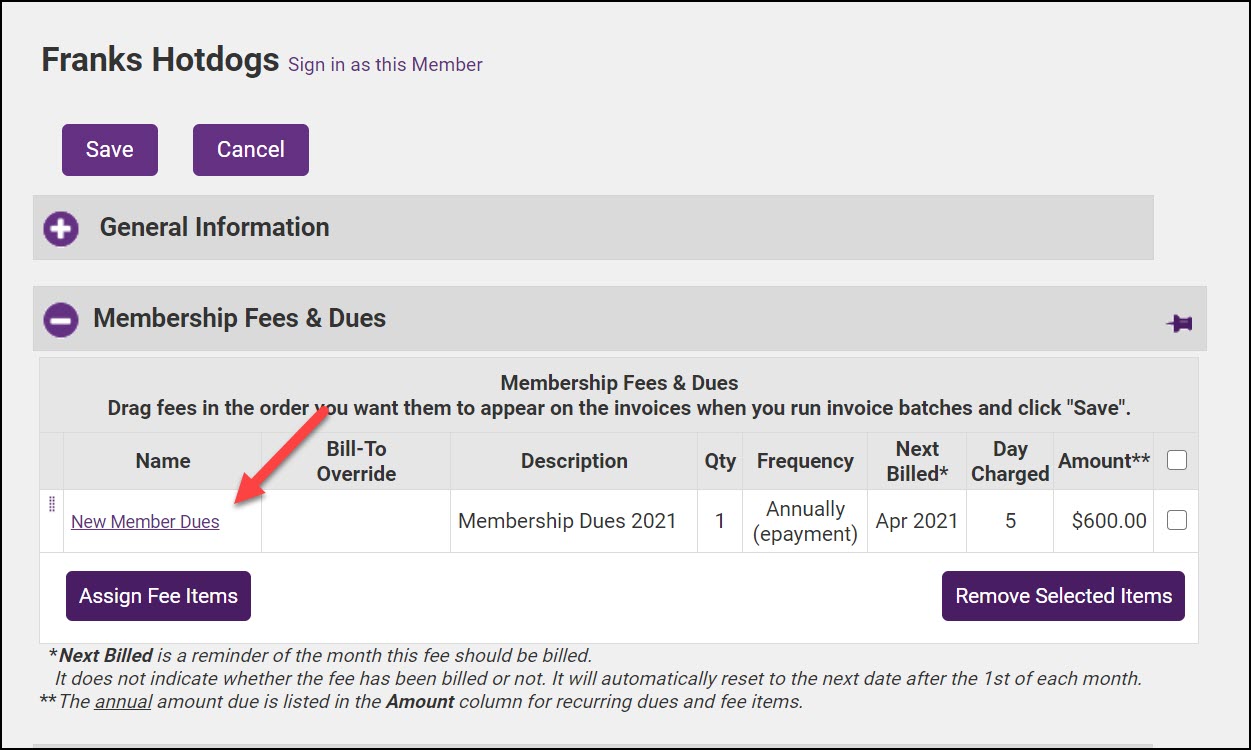 - In the Membership Fees & Dues section, click the hyperlink for the fee item you wish to change.