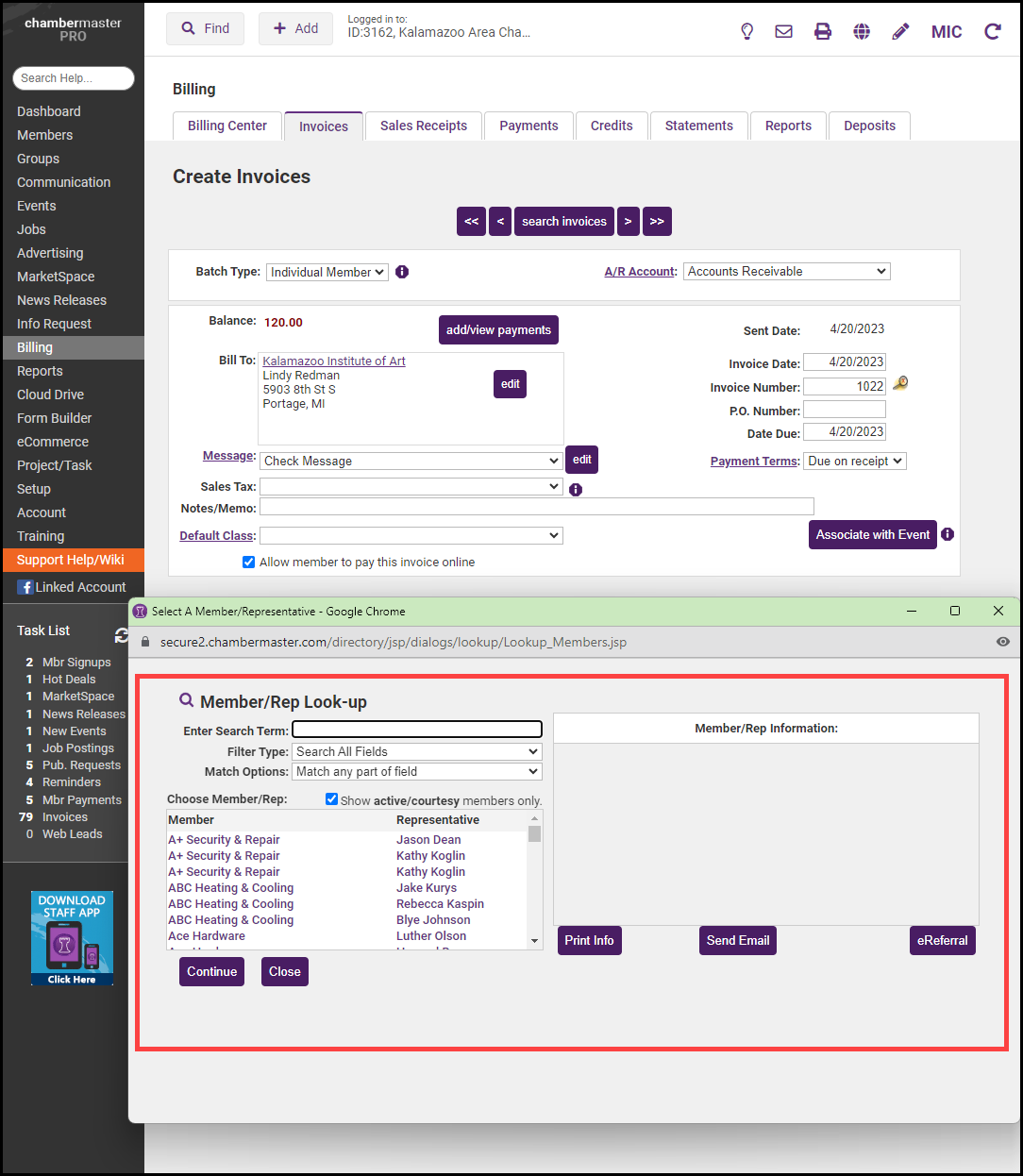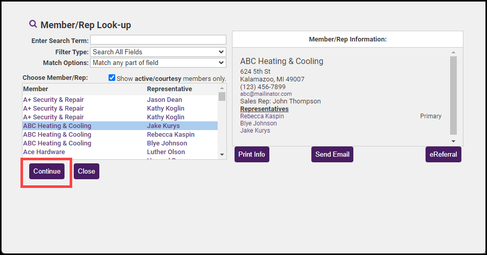 - On the Member/Rep Look-up screen, choose the member to which you wish to move the invoice.