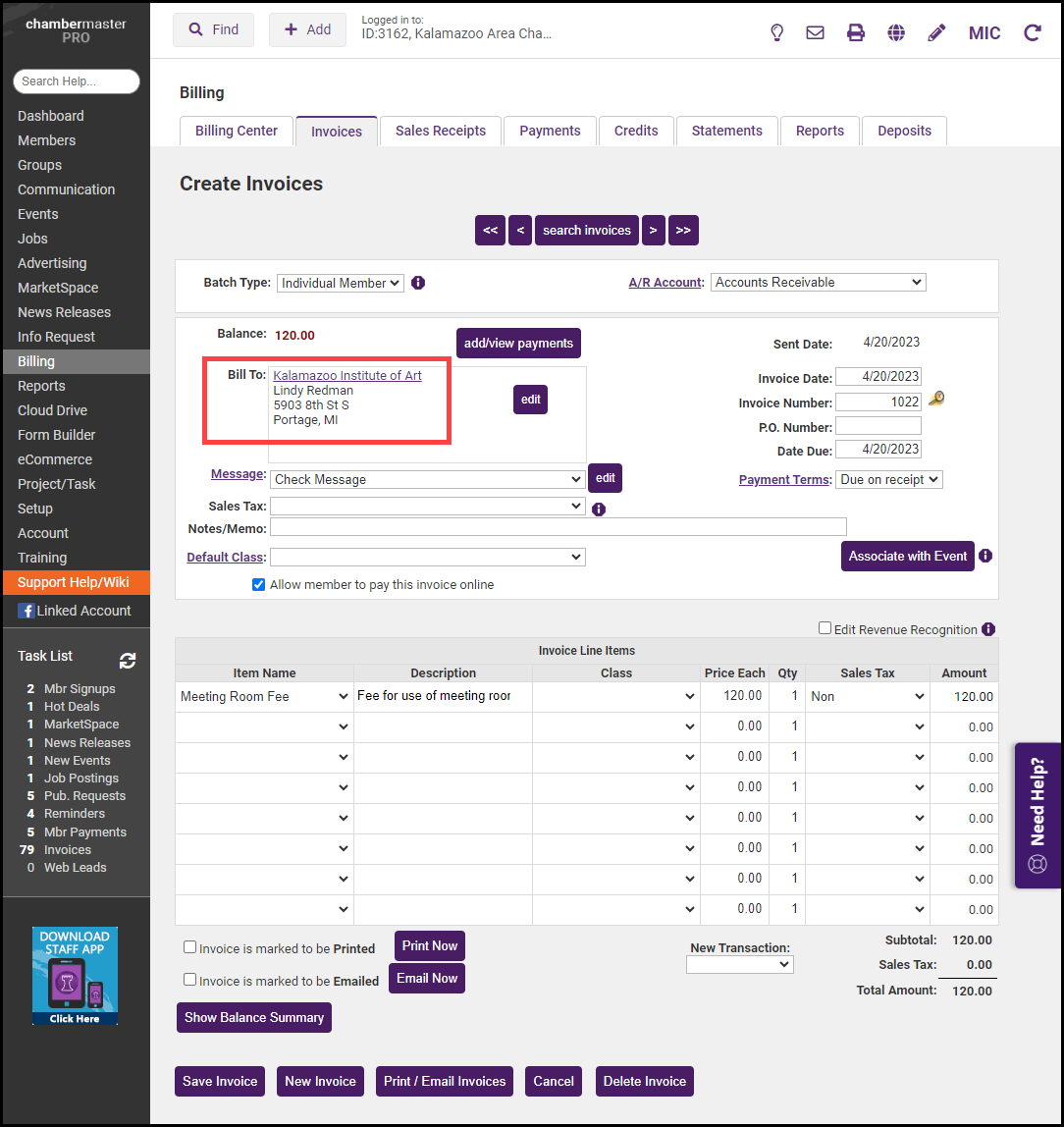 In the Bill To section, click the member name hyperlink.