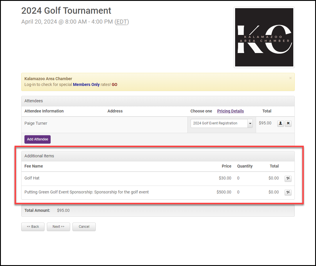 - During the registration process, the attendee will see the Additional Fee Items and will be able to add any to their registration.