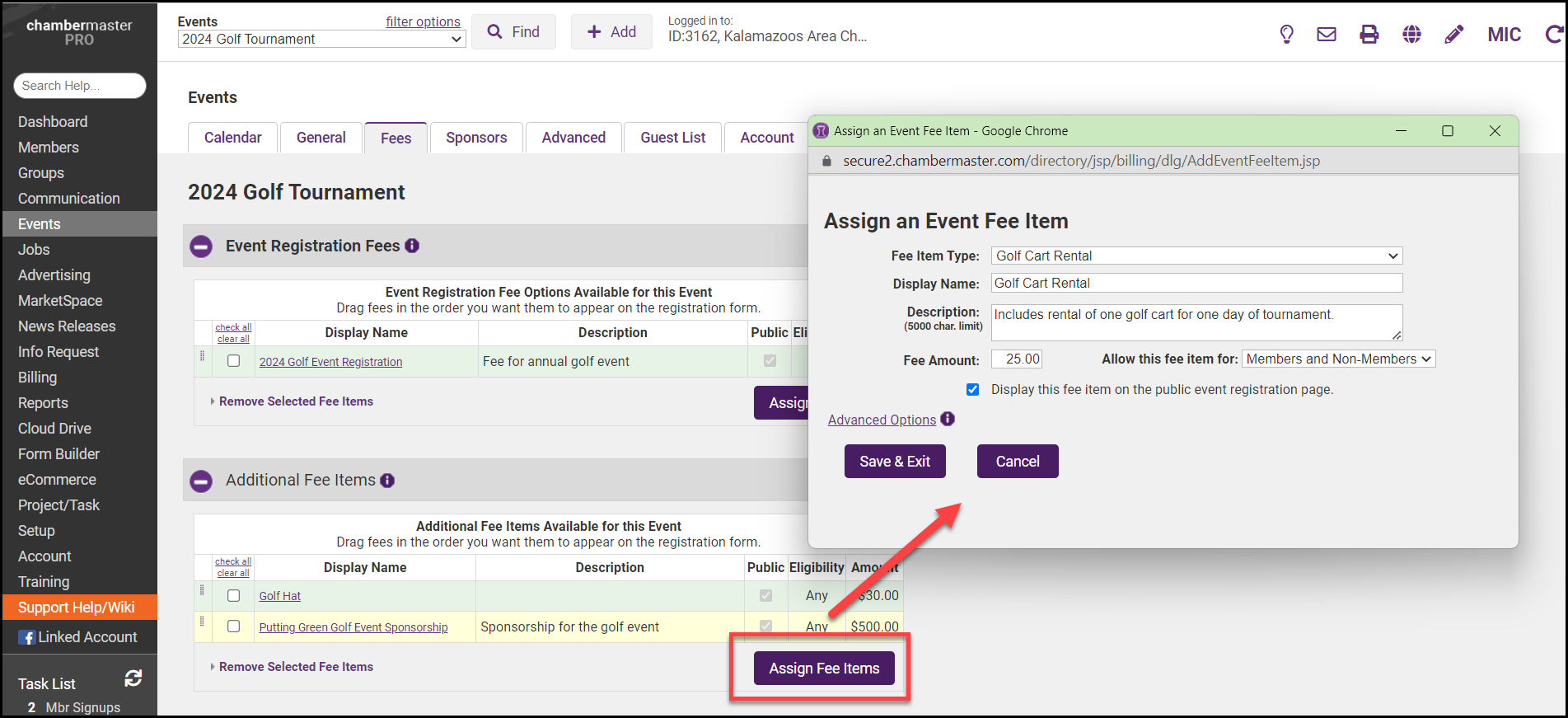 - In the event's Fees tab, click Assign Fee Items in the Additional Fee Items area.