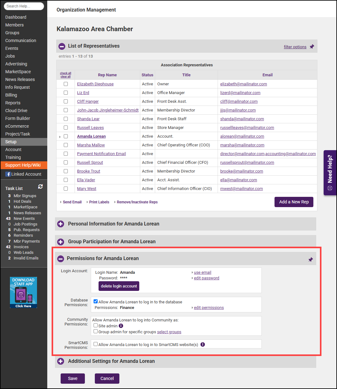To create a login account for this staff user, click their name in the List of Representatives, expand the Permissions for... section, and click Create Login Account.