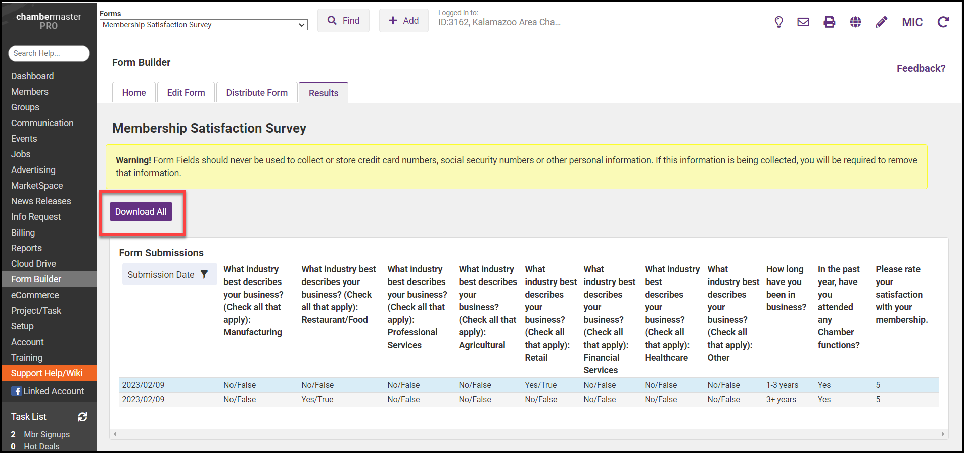 The Results tab for the survey will display a list of all submissions. The results can be downloaded by selecting the Download All button.
