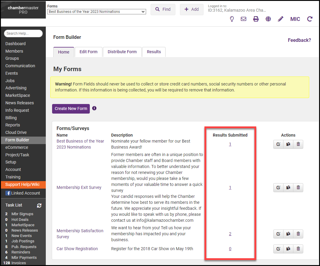 On the Home tab, click the numbered link in the Results Submitted column for the desired form.