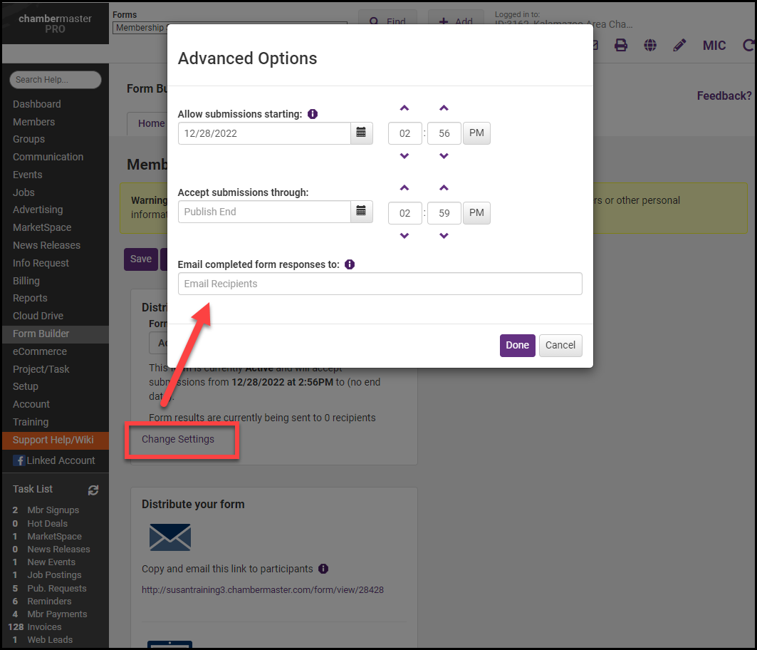 - In the Email completed form responses to box, enter the email addresses, you would like to have receive the results. To have the results sent to multiple email addresses, separate each email address with a comma and no spaces.