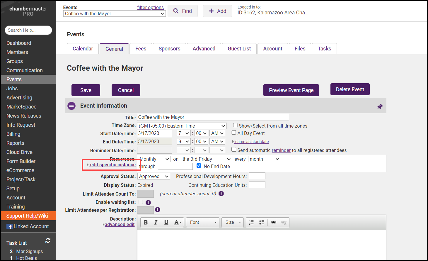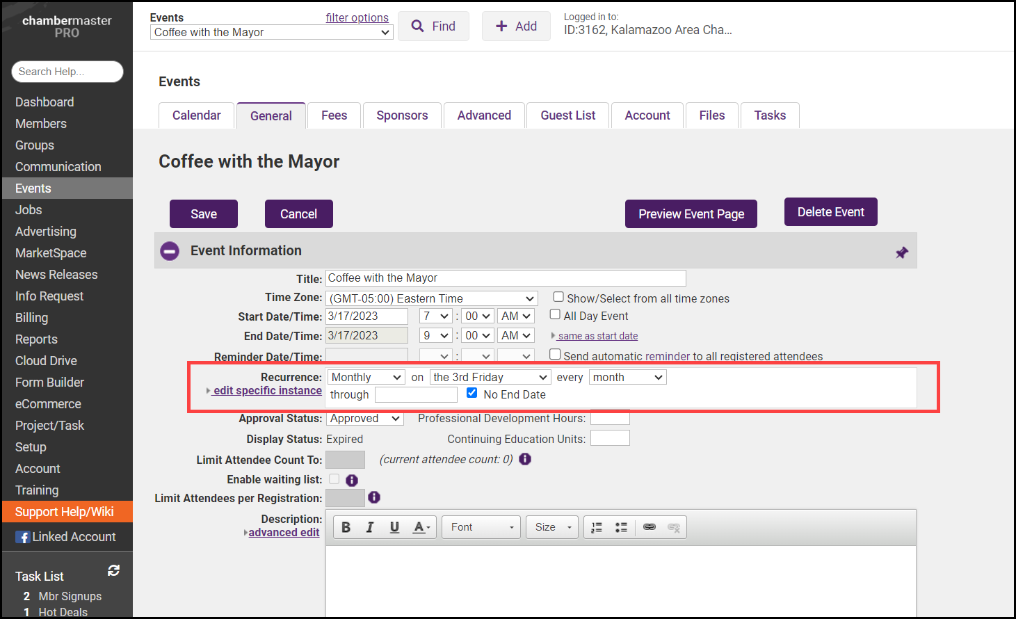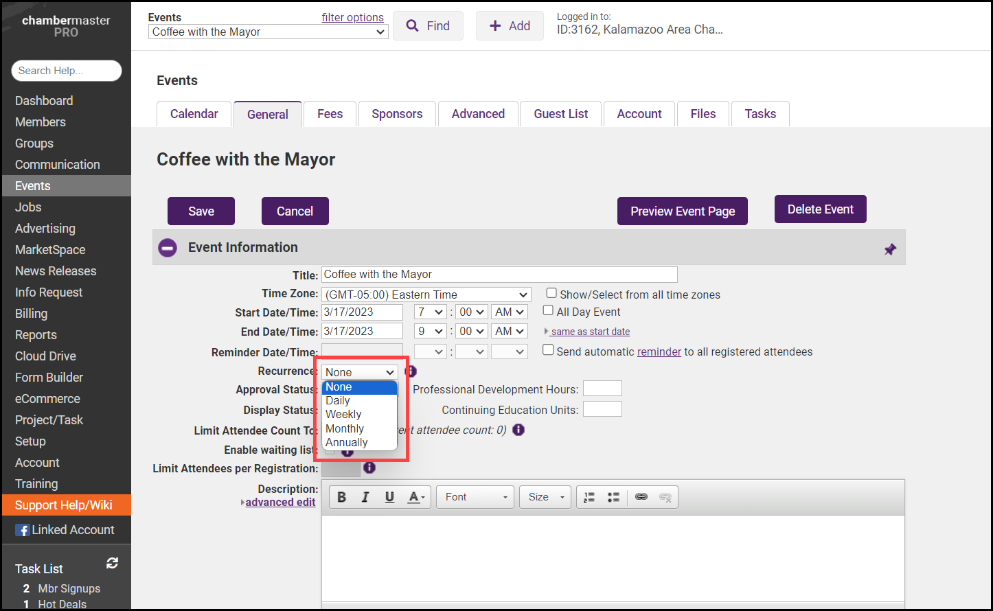 If your association has an event that occurs on a regular basis, save time by setting it up as a recurring event. Most of the details of the original event will be applied to the recurring instances. Event Details that are not carried over when setting up a recurrence: