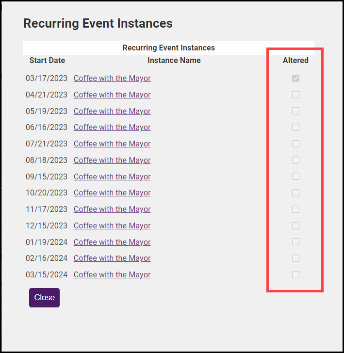 A checkbox will be set in the Altered column for those instances that have been modified.