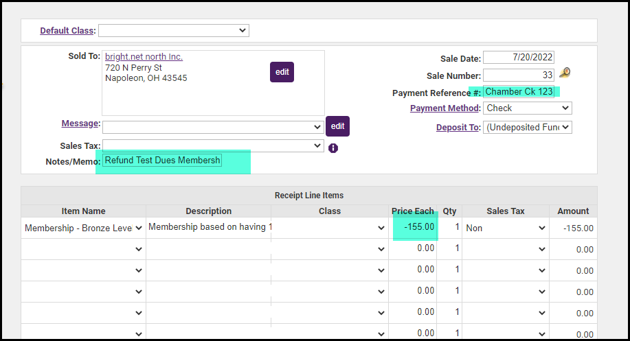 - Create a New Sales Receipt and document the chamber's check number, date, and amount in the negative.