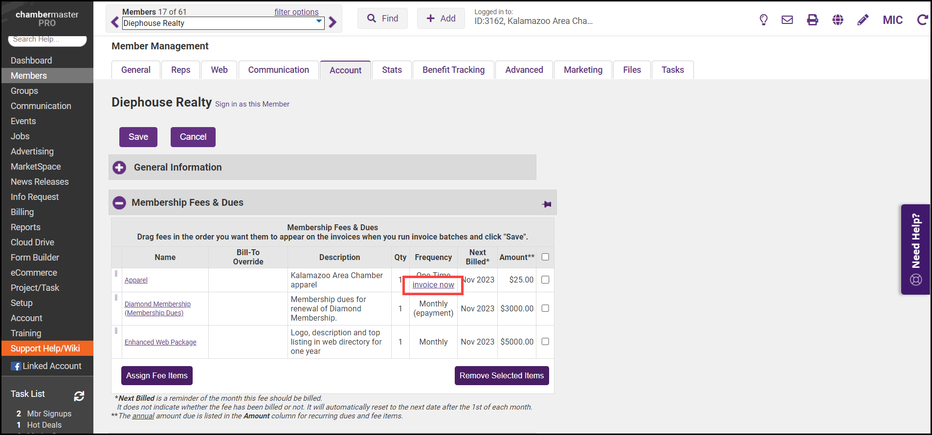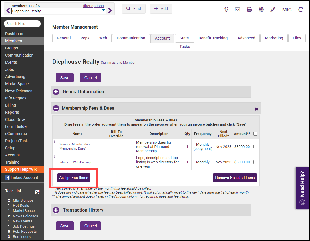 On the Account tab, ensure that the one-time fee item has been added in the Membership Fees and Dues area. If not, click Assign Fee Items and add the one-time fee.