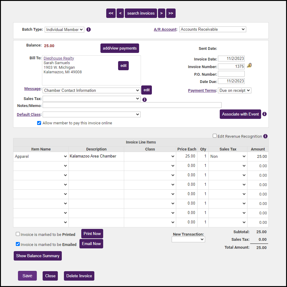 Click Save. The invoice is automatically created at this time and is ready to be delivered.