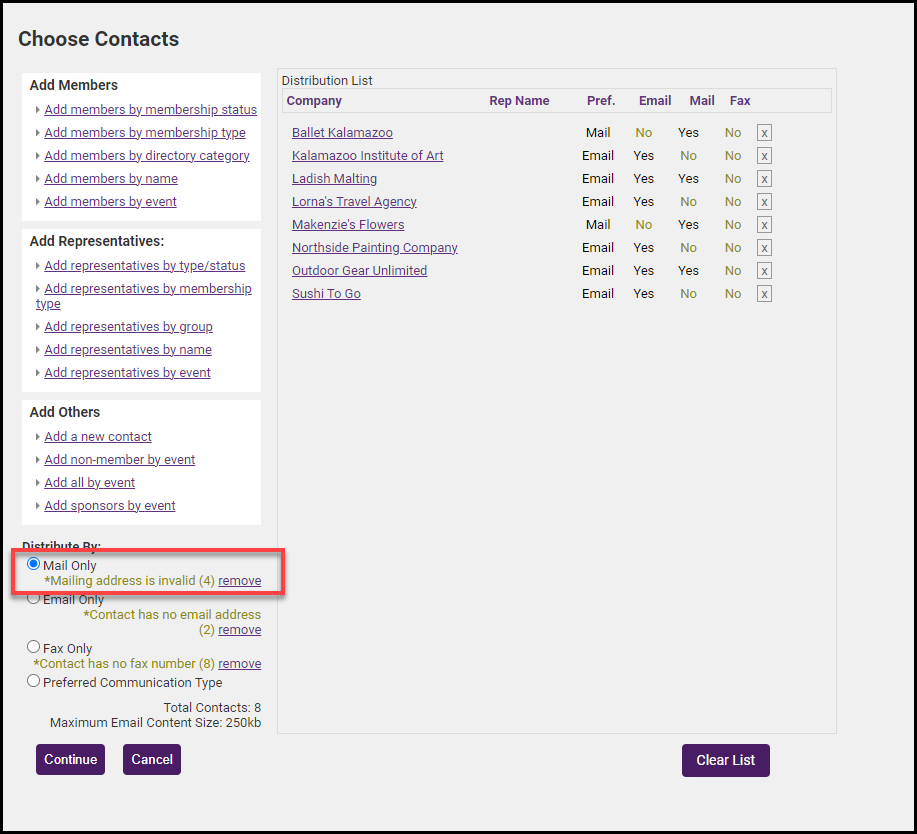 - If applicable, click remove if mail address(es) have been identified as having no contact information, duplicate addresses, or invalid addresses.