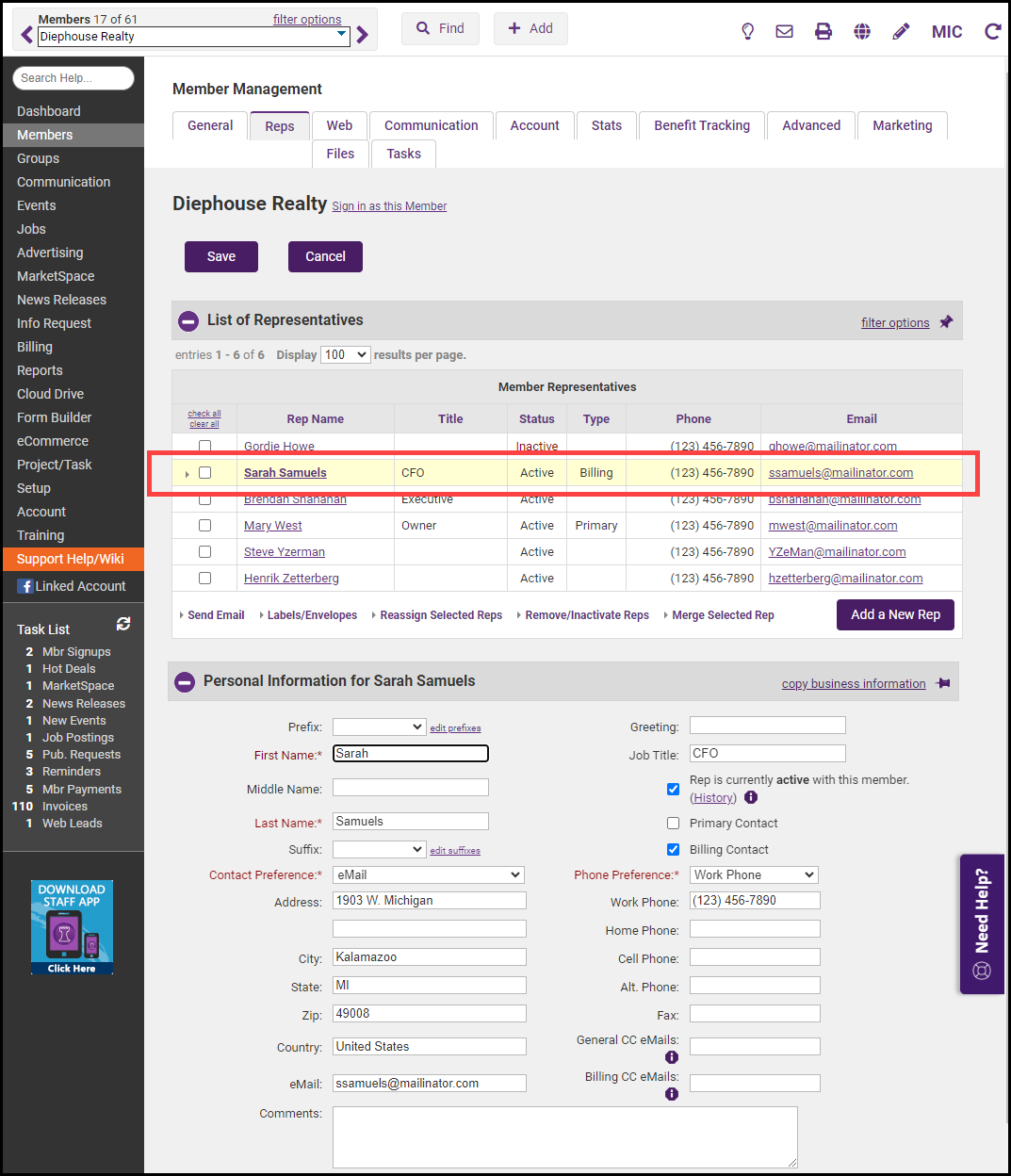- On the Reps tab, select the Rep who is currently receiving invoices in the List of Representatives.