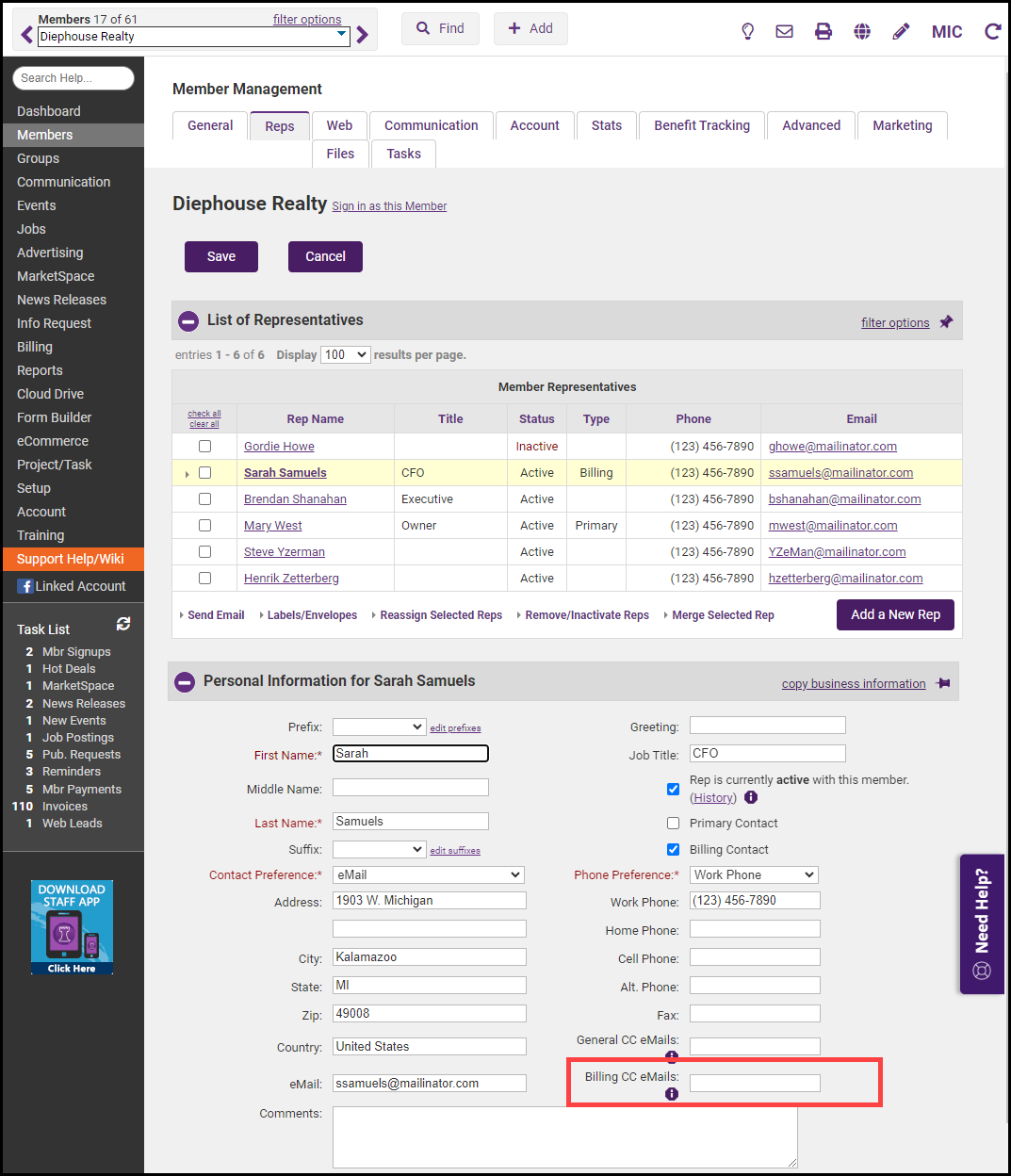 In the Personal Information section, enter the email address of the rep who should receive a Carbon Copy (CC) of billing transactions that are emailed to this rep. If more than one person should receive a copy, separate the email address with a comma.