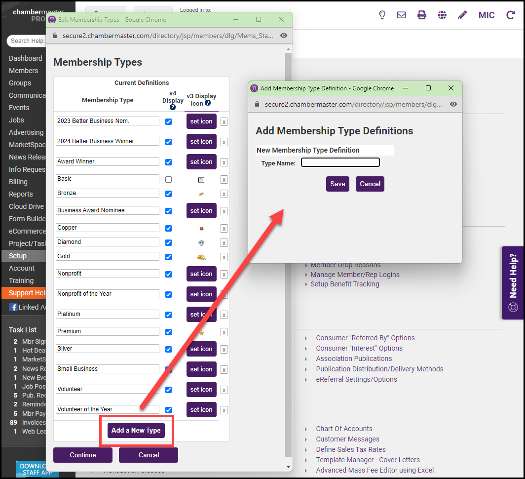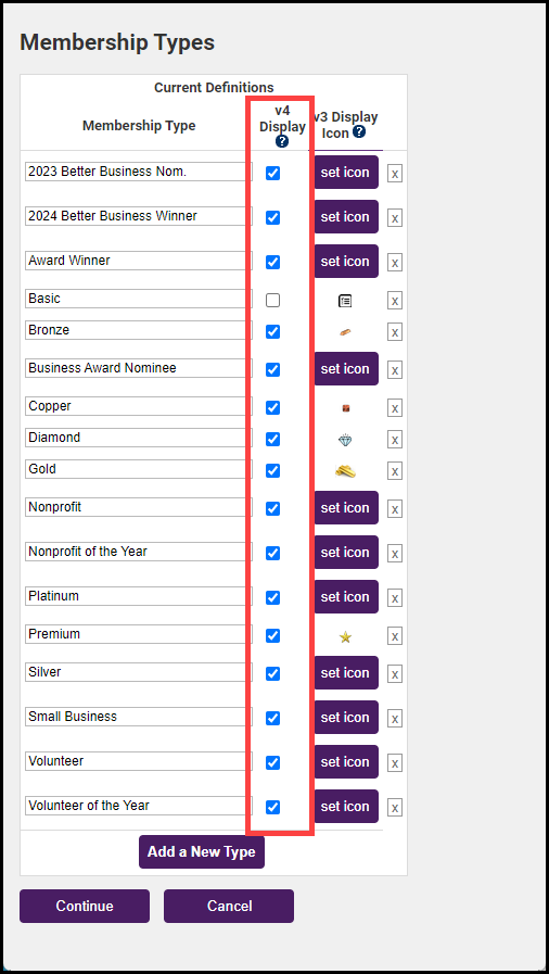 To display the Membership Type as a small banner above the member's listing in your public directory, select the v4 checkbox.