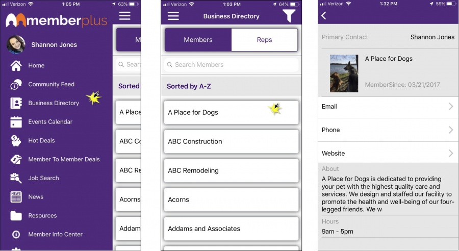 With the MemberPlus App, your members will be able to search the member directory, as well as search for reps, and groups. From the directory, members will be able to connect by getting directions, sending emails, and making phone calls directly from the MemberPlus App.