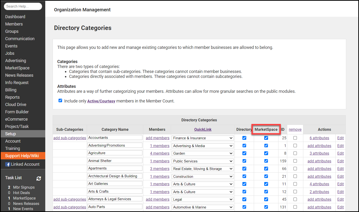 Note: If the MarketSpace name has been changed, the checkbox title may not be 'MarketSpace'. Look at the title used in the left-hand menu to determine the title of this column. If you select a main-level category as a MarketSpace category, all its subcategories will also display as MarketSpace categories.