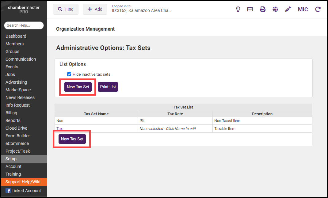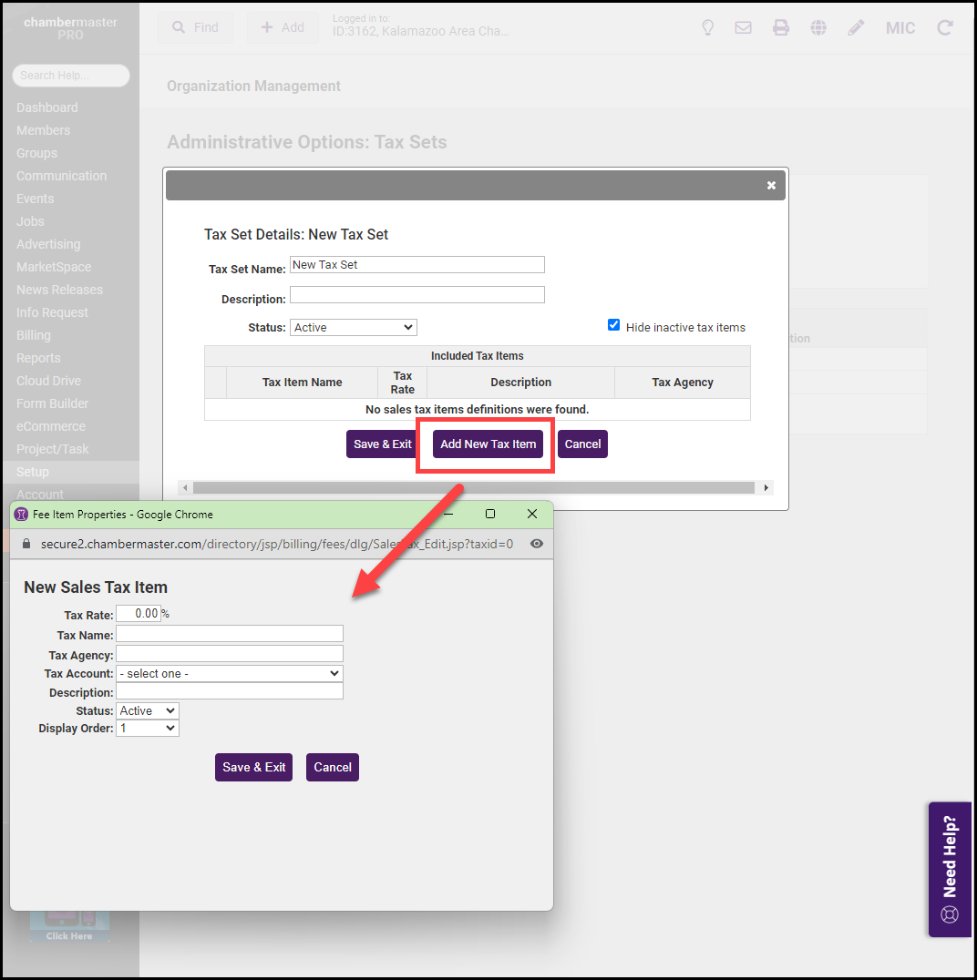 - Enter the Tax Set Name and Description. Select Add New Tax Item and enter the appropriate information in the New Sales Tax Item window.