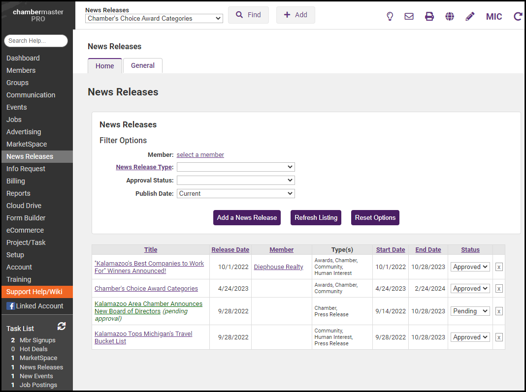 If given permission to do so, your members can submit news releases via the MIC. The Task List will notify of News Releases that require approval. Additionally, staff members who are subscribed to the content (deal, job, event, etc.) submitted that may need approval, will receive a notification email.
